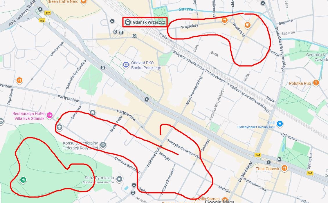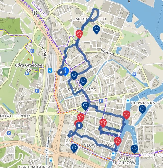 Примерно в центре находится станция Gdańsk Wrzeszcz, от которой проще всего построить свой маршрут.