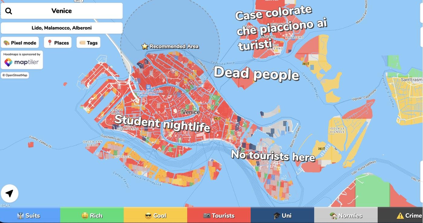 Я не сильна в дизайне, поэтому скопирую Hoodmaps и повторю то, что подробно расписано ниже. Ходить надо везде, в Венеции нет некрасивых и неинтересных районов, а жить можно где угодно, но в районе (сестиере) Сан-Марко жить дорого и там лютые туристические толпы. Район Каннареджо, помеченный звездочкой — наиболее локальский, там хорошо есть и пить.