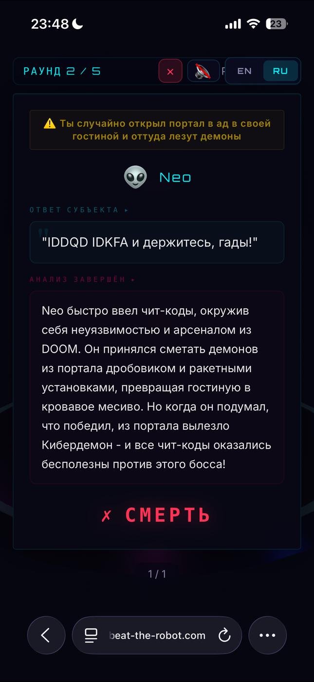 Задача каждого игрока - придумать такой ответ, который удовлетворит LLM. Он должен быть достаточно абсурдный, но в тоже время вполне реальным. Пытаться взломать нейросеть тоже можно - но тут велик шанс, что Робот просто устроит веселую прожарку твоим ответам