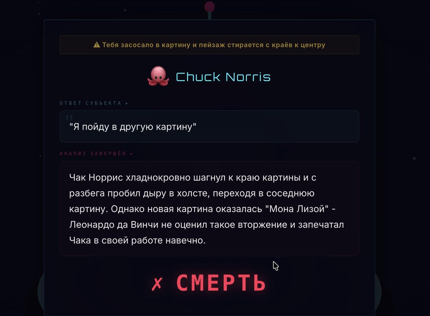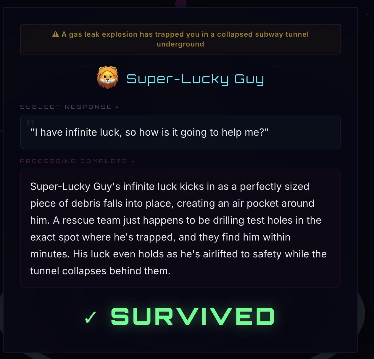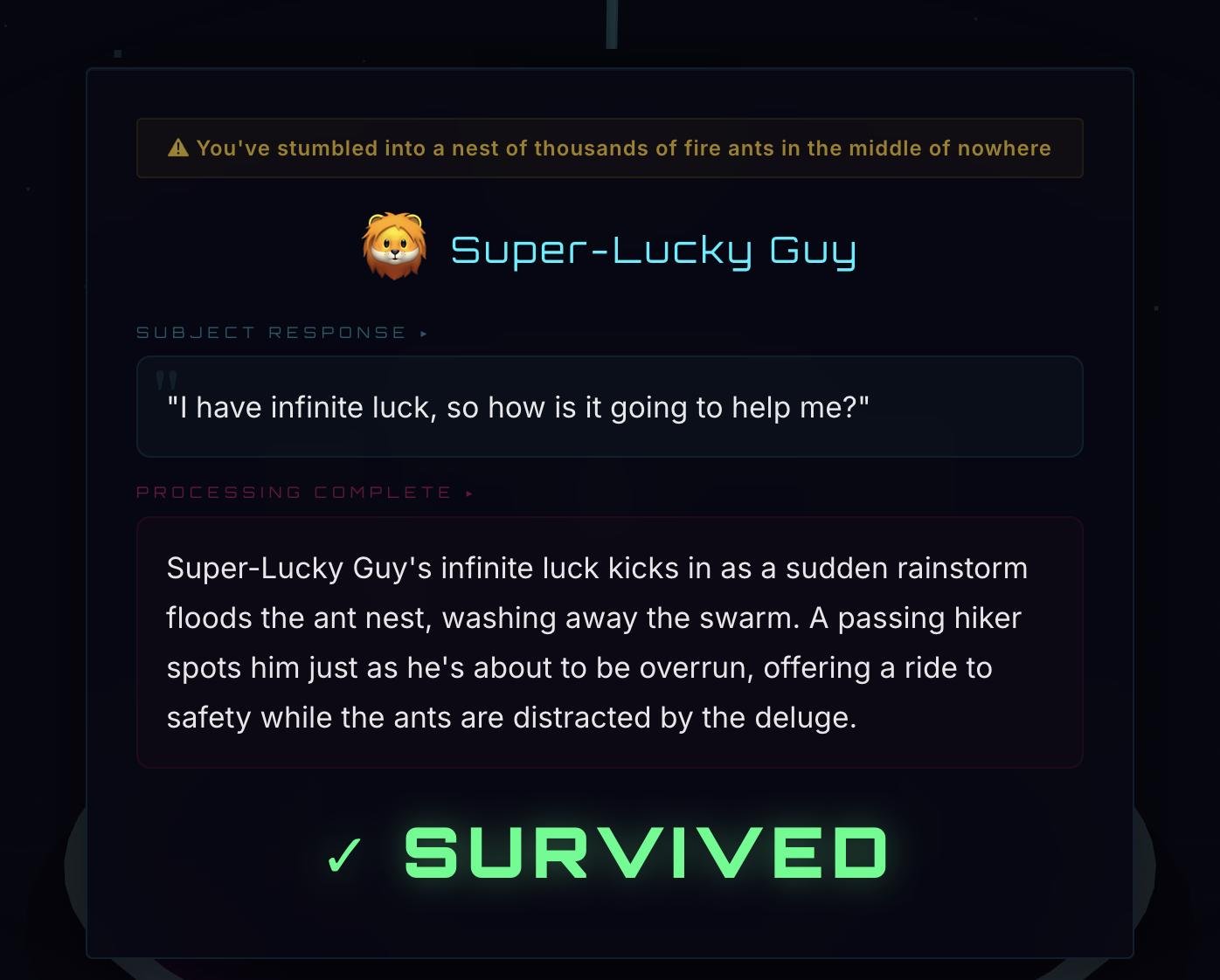 Системный промпт показывает нейронке ситуацию и промпт пользователя, просит развить события и вынести вердикт: выжил игрок или нет. Все это приправлено щепоткой юмора.