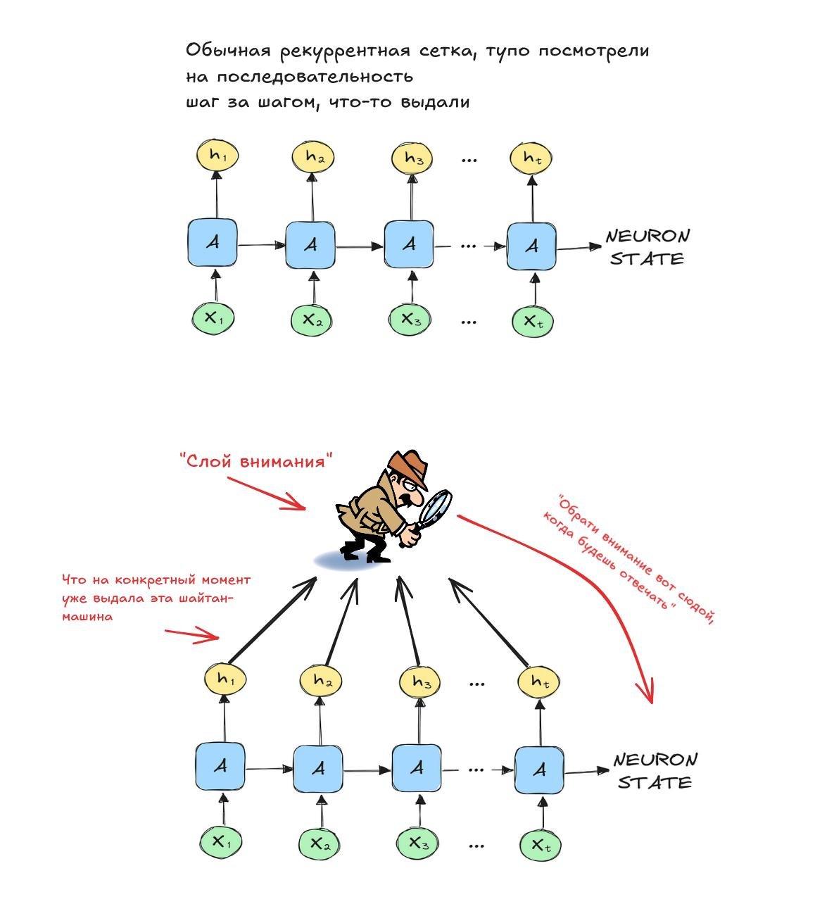 В принципе, даже машинный перевод уже получался неплохой, но такой же невыносимой лёгкости бытия как с картинками не было. Но потом придумали новый слой для нейросеток и вы по названию параграфа можете понять, что это за слой. Да, attention layer называется. Ребята придумали такую вещь: "когда происходит перевод, разные слова в разных местах влияют на то, какое слово нужно предсказать следующим, давайте тогда поможем Даше подсмотреть, на какие слова в данный момент нужно обратить внимание для предсказания!".