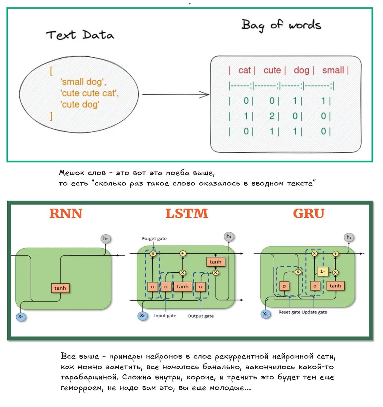 Если с картинками кое-как разобрались и решают много прикольных задач, с текстом такой прикол очень долго не проходил. Изначально задачи с текстом решали методом bag-of-words, то есть пофигу как слова сложены в текст, главное что сами слова на месте. Спам-фильтр на таком подходе ещё можно построить, но на этом наши полномочия всё, закончились. Потом, вспомнили такую штуку как рекуррентные нейросетки. Теперь текст это не просто мешок слов, а последовательность слов, а сама нейросетка теперь будет искать зависимости внутри последовательностей слов.