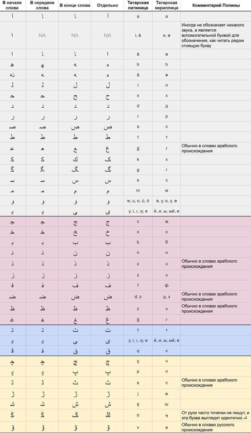 В этой таблице наоборот, буквам современной татарской кириллицы ставятся в соответствие буквы иске имля. Она на татарском, но я далее в посте поясню полезности из неё и по-русски.