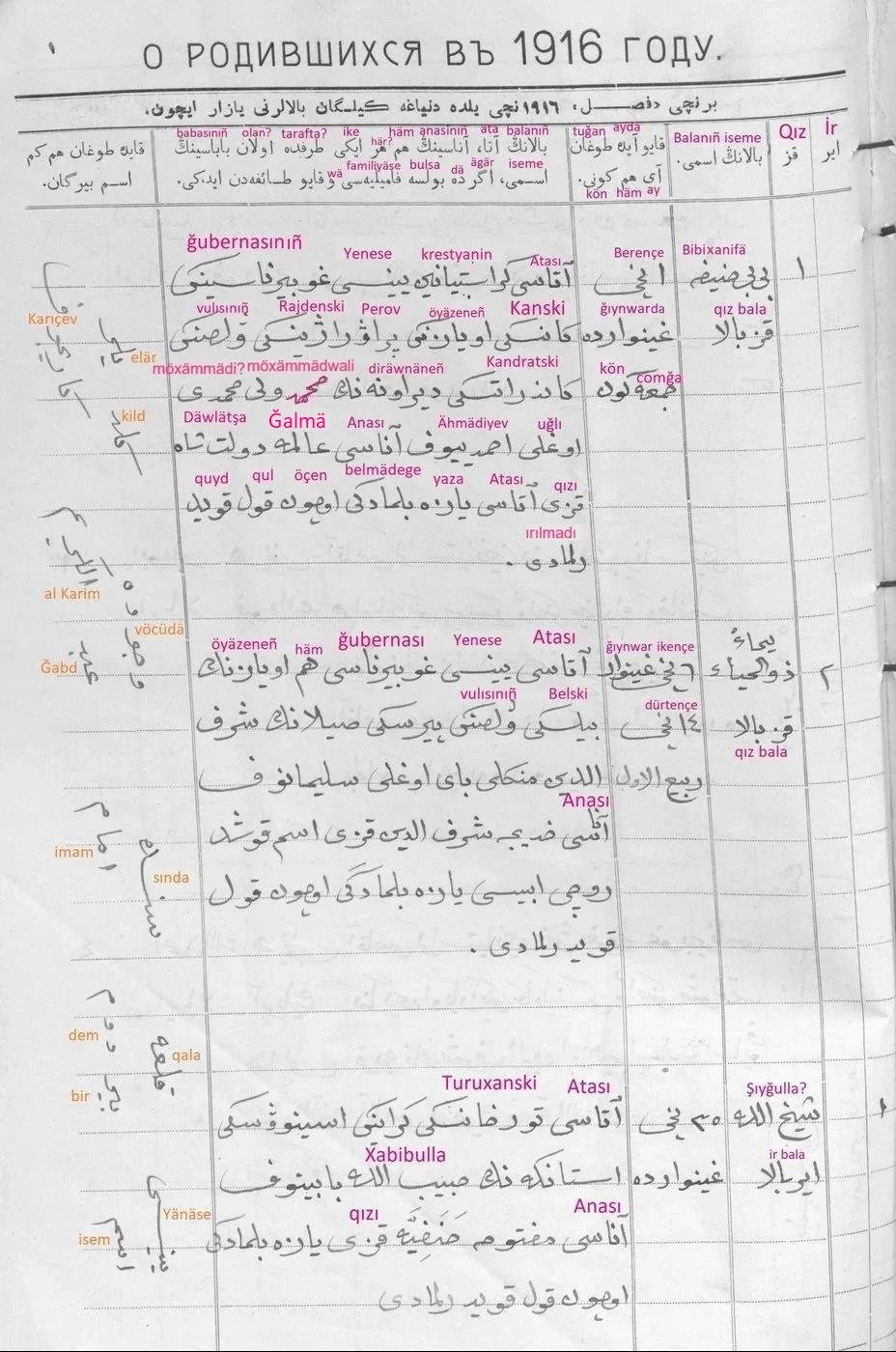 Смешно вышло — 2 недели училась читать на арабице, чтобы обнаружить, что запись о рождении прабабушки продублирована по-русски. Что ж, могу подтвердить, что на поволжско-уральском тюрки там тоже написано «Сабира, 9 марта, 14-го имянарекли, отец енисейский мещанин Якуб Гайнуллович Хасанов, мать Хадича Хайрутдиновна». Только мать не Хасанова, а Алтынбаева.