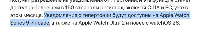 — новые уведомления о высоком кровяном давлении (гипертонии). Ожидает финальной сертификации FDA в этом месяце. Но это будет доступно с Series 9 и Ultra 2, так что сенсора нового нет