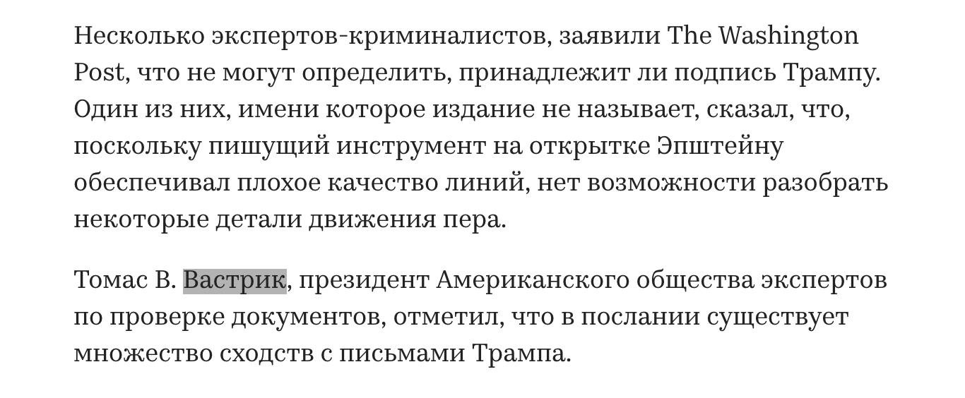 Так вот, еще в июле WSJ писали, что в их распоряжении есть похабная поздравительная открытка Трампа на день рождения Эпштейну, которую тот подарил ему на юбилей в 2003-м году. Трамп тогда сказал, что это всё 100% фейк ньюс и вообще, но на прошлой неделе открытку-таки опубликовали. Подпись там явно Трампа, такие дела. В американских Твиттерах массовые подрывы филейных частей.