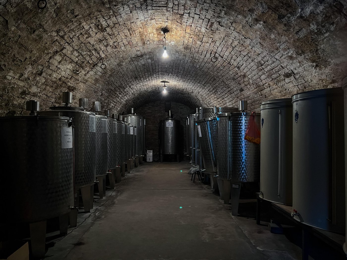 Вера (владелец винодельни) пригласила нас в длинный погреб с бочками, черным местами потолком из кирпичей и бутылками вина на полках.