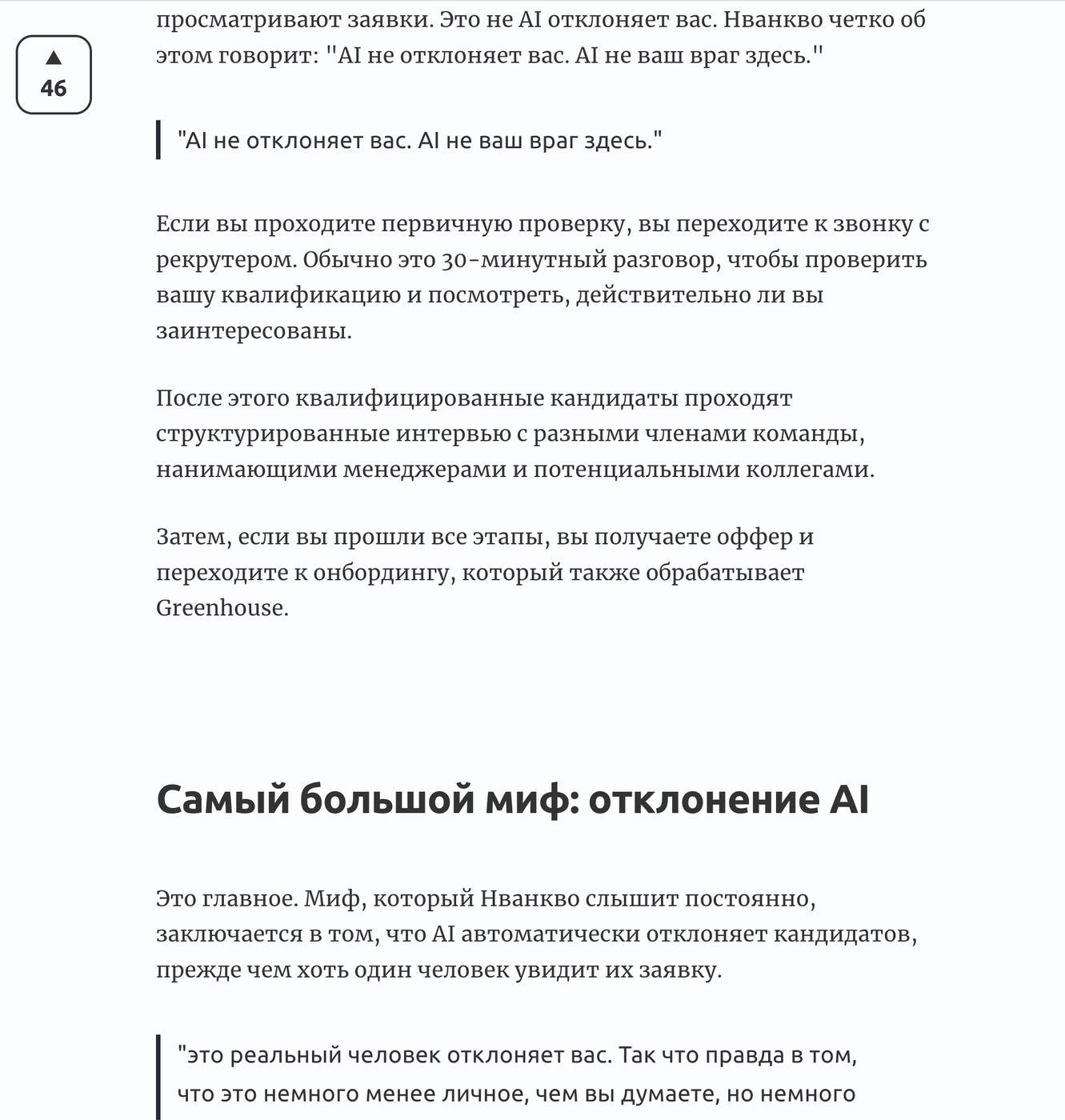 Очень странные ощущения от статьи. Ожидал, что будут конкретные мифы, конкретные примеры, а на деле - пересказ откровенно саморекламирующего интервью с кем-то из Greenhouse.