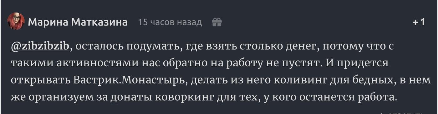 Субъективное мнение: что-нибудь бы, на что не нужно собирать деньги год, отказывая себе в помадах, пиве и колбасе. Простите, я вас всех очень люблю и читаю и правда хочу куда-то поехать, но нам даже Флот в этом году уже не очень был вывозим, не все тут айтишники, некоторые вот занимаются рекламой и медиа в РФ, потому что больше ничего не умеют. Оригинальность и замороченность форматов и локаций — это здорово, но разве это главное? Студенческая пьянка на даче может быть прекрасной, если это дача какая-нибудь прикольная заброшка, не знаю. Если бы был ряд ивентов и их делала я — но меня никто не спрашивает — а нет, как раз спрашивают! — я бы варьировала их как-то по уровню задроченности необязательными вещами вроде мерча и приглашений групп, чтобы была возможность большему числу людей участвовать и не образовывался имущественный ценз.