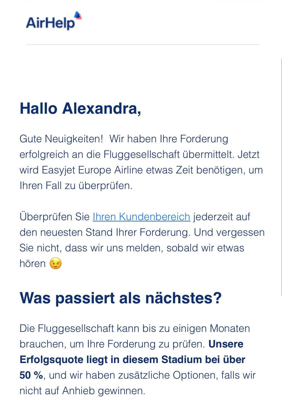 27 августа мне пришло сообщение от AirHelp, что они передали мой кейс easyJet.