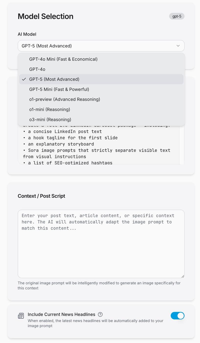 Промпты всегда актуальны — новости тянутся автоматически.Интерактивное редактирование результата.