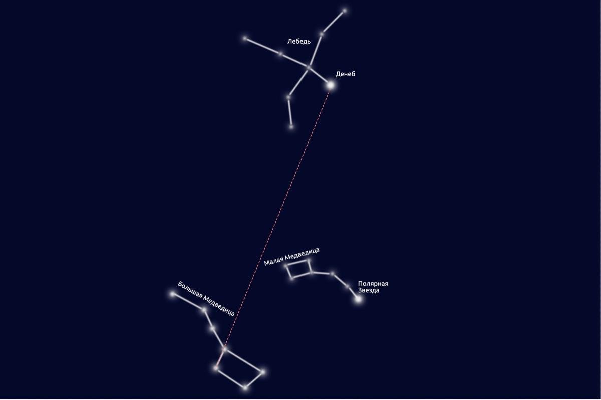 Как найти? — Берем две звезды ковша Большой Медведицы и продолжаем линию примерно на 60 градусов (т.е. на треть неба где-то). Вы упретесь в очень яркую звезду — Денеб — в вершине яркого креста. Вечером летом Лебедь находится прямо над головой.