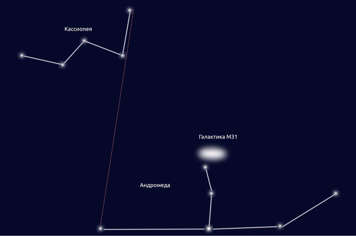 Найти ее очень просто: находим Кассиопею, от нее — Андромеду. Берем вторую звезду в “линии” и от нее отсчитываем 2 звезды вверх — 7 градусов (это примерно 4 пальца). Удобно приложить указательный палец к нижней “линии” и смотреть над мизинцем.
