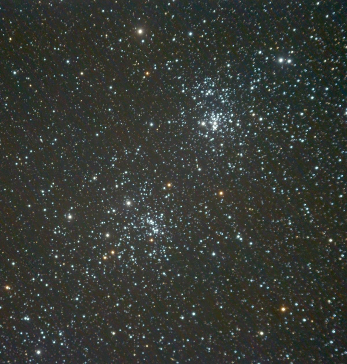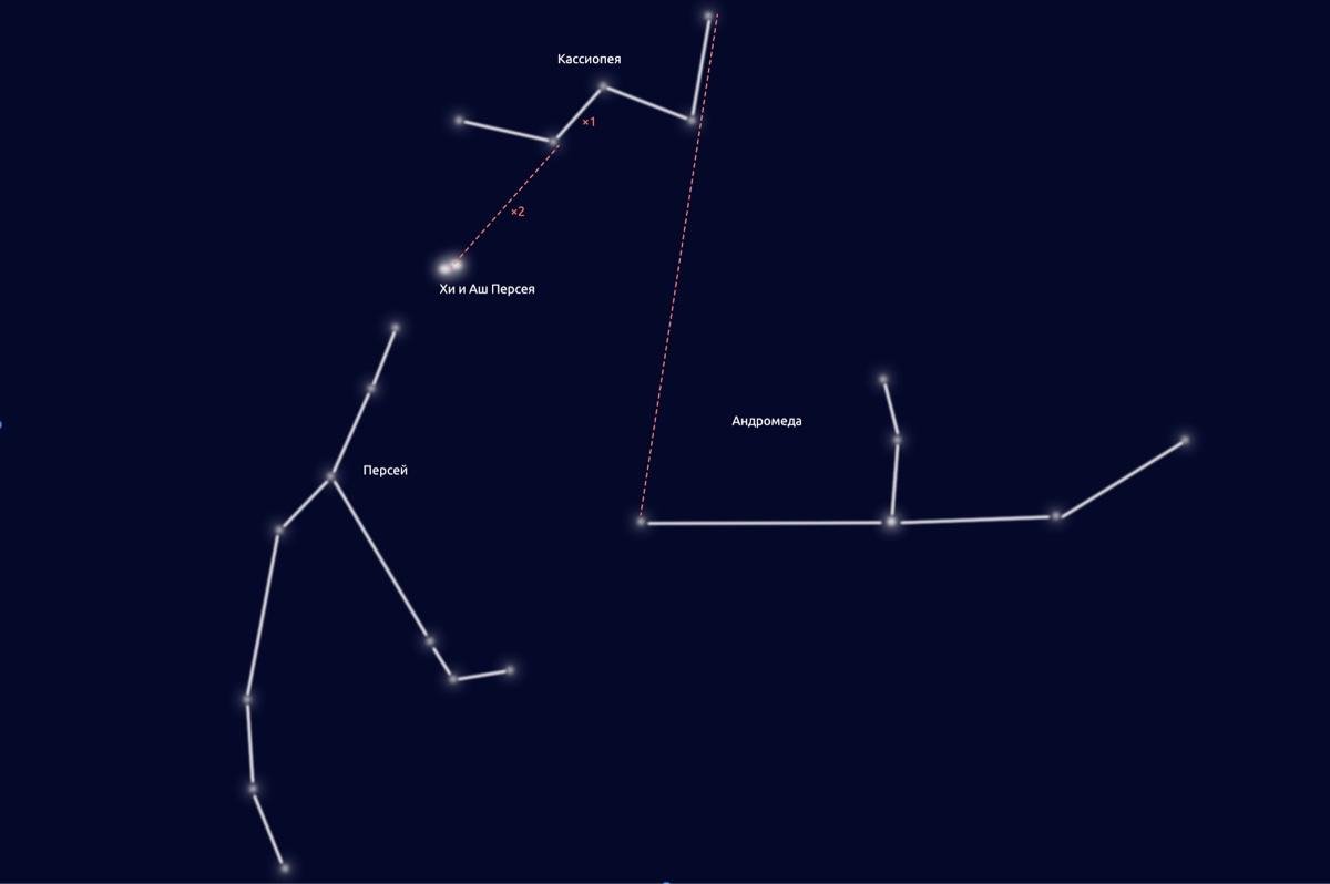 Еще одно звездное скопление — в созвездии Персея. Оно не так хорошо видно, как Плеяды и Гиады, но в темную ночь его вполне можно наблюдать. Он гораздо дальше от нас — около 7500 св. лет. Он совершенно незабываемо выглядит в телескопе (и даже с биноклем), но и невооруженным взглядом можно увидеть. Найти очень просто: помните, как мы искали Персей? Вот так же, от Кассиопеи идем вниз, примерно на 7 градусов от нижней звезды (4 пальца) или два расстояния между 2 и 3 звездой Кассиопеи.