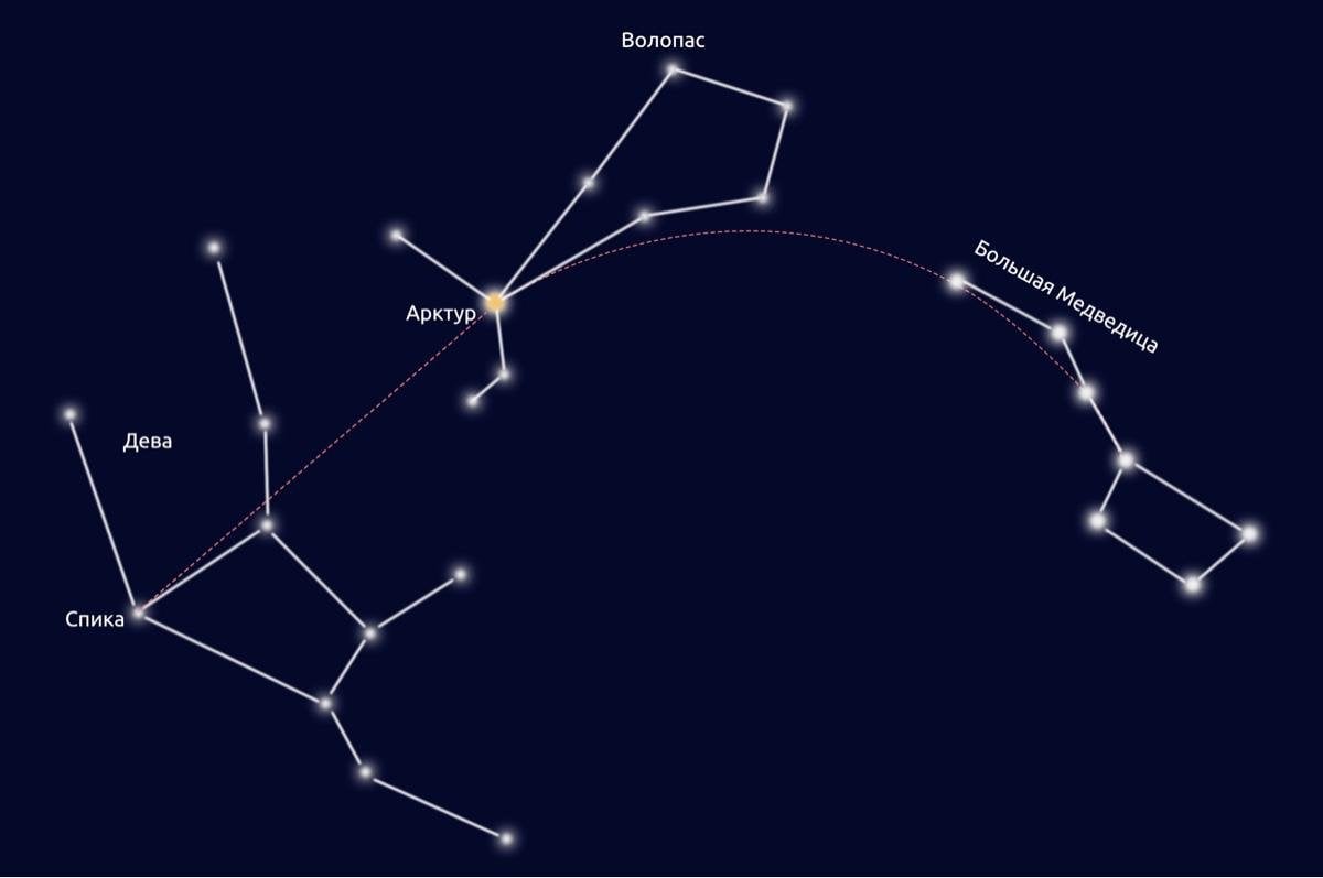 Продолжаем дугу через Волопас до Спики — главной звезды Девы. Расстояние примерно как от Большой Медведицы до Арктура.