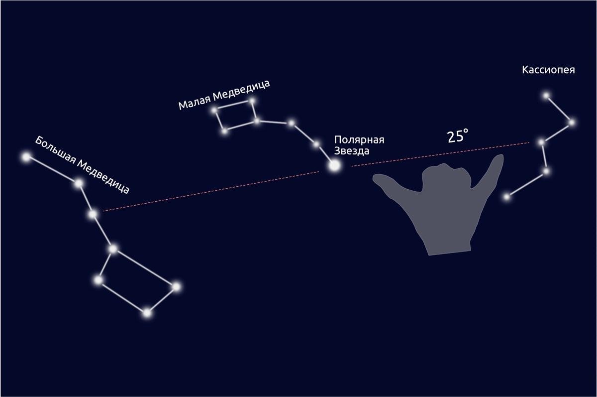 Как найти? — Ну вообще, это одно из самых видных созвездий — W звездного неба и все такое. Но любопытно, что оно находится ровно симметрично Большой Медведице относительно Полярной звезды. Берете первую звезду ручки ковша, проводите линию через Полярную звезду и отсчитываете снова 25 градусов. Вуаля — вы прибыли в самый центр Кассиопеи!
