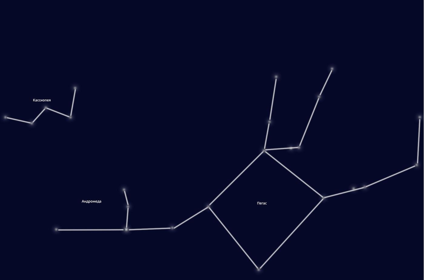 Последняя звезда в “линии” Андромеды превращается в огромный квадрат Пегаса. Опять же. Кубический конь в вакууме.