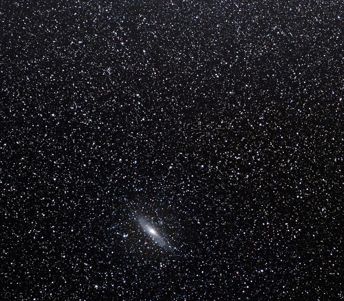 Ближайшая к нам галактика — огромная и красивая. Можно рассказать, что она находится на расстоянии в 2.5 млн световых лет: т.е. свет, который мы видим, был испущен 2.5 млн лет назад! В ней около триллиона звезд — и мы это видим как малюсенький туманный участок. Не знаю как у вас, у меня каждый раз захватывает дух.