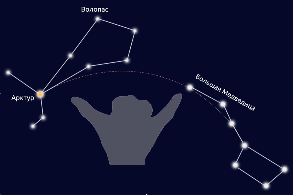 Как найти? — Проведите дугу, которая как бы продолжает дугу ковша Большой Медведицы — вы упретесь в яркую звезду Арктур. Расстояние — чуть больше 25 градусов.