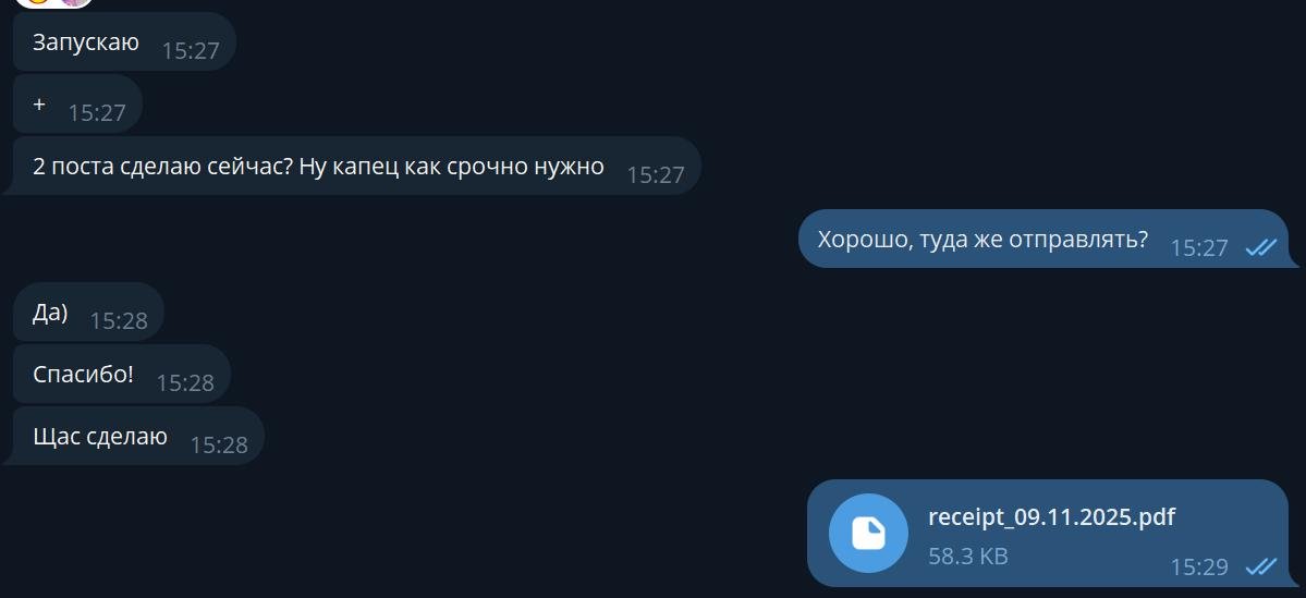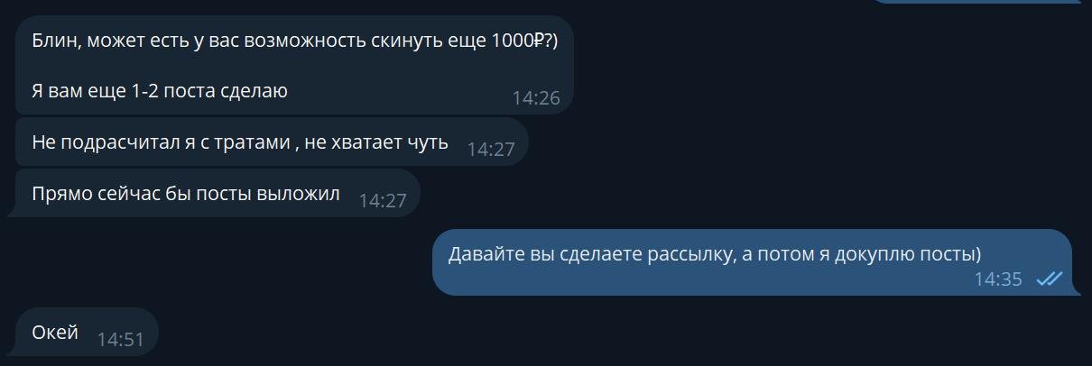 Я купил у него рассылку, "обычно за 24-48 часов достигается максимальный эффект". Обещал сделать позже, потом пришёл с просьбой скинуть ему ещё немного денег, чтобы он дешевле опубликовал посты. Я уже заподозрил неладное, но деньги не большие, потому скинул.