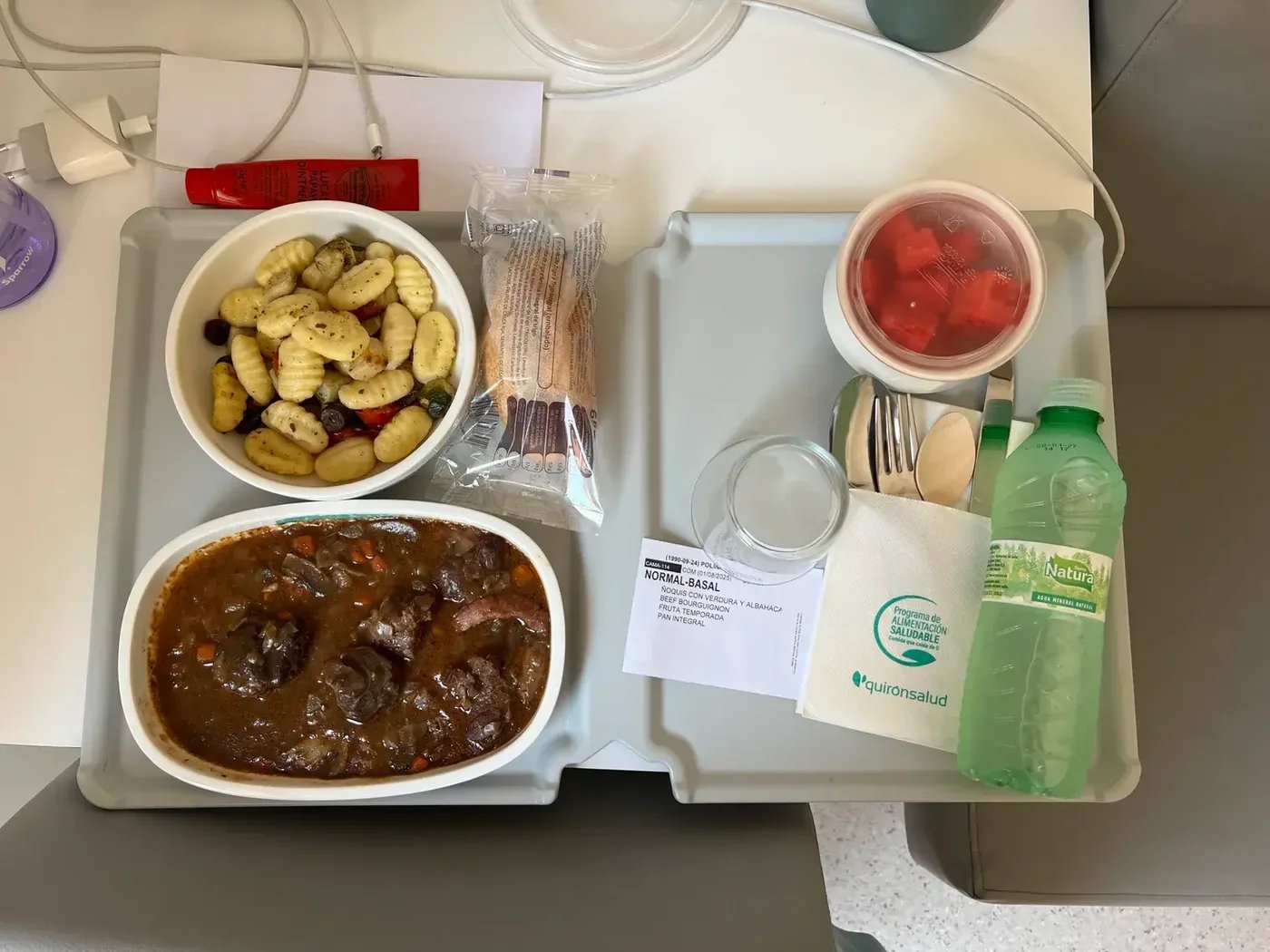 В палате мне выдали медицинскую ночнушку, прокладки, полотенца. Совет: берите с собой воду — кулеров нет, бутылочку дают только с едой, а бегать к автомату в родах не очень удобно. Чайника тоже нет, потому что испанцы чай не пьют.