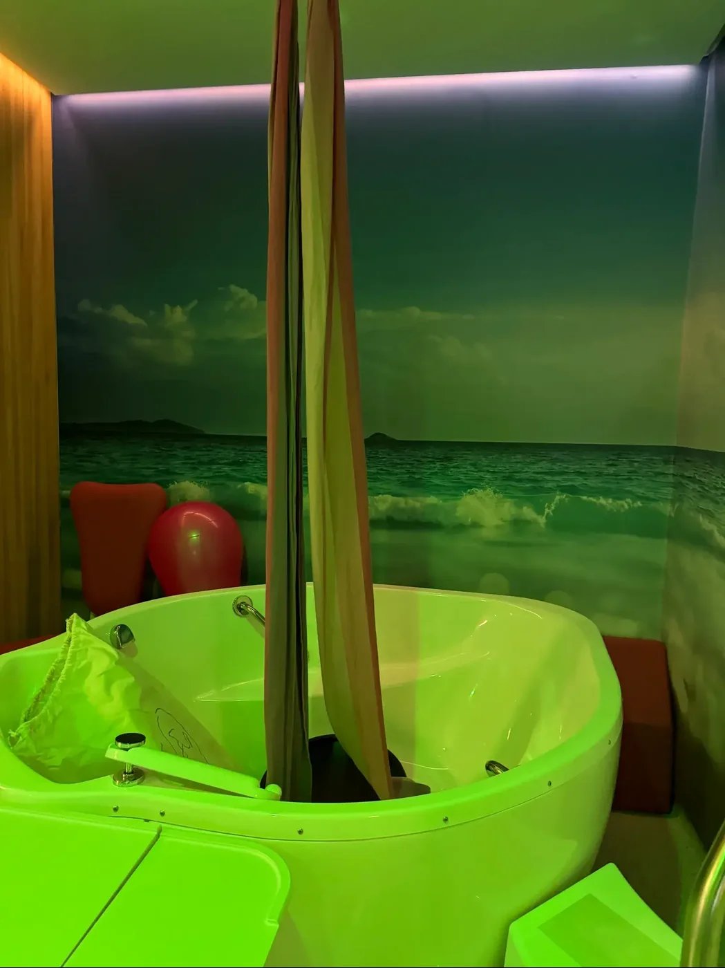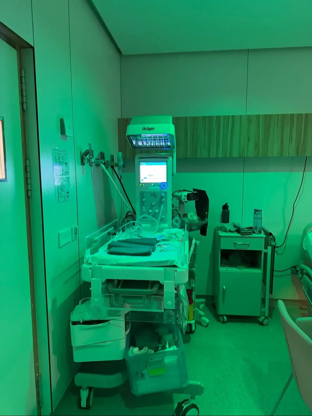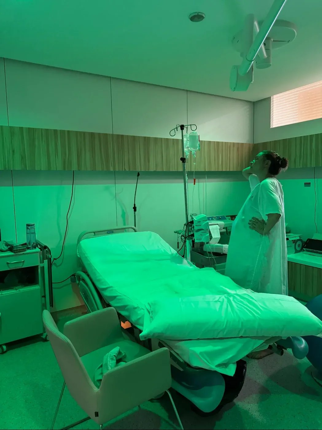 В родзале был полумрак, были фитболы, ванна (её наполнение стоит 500 евро и не входит в страховку), специальный стул, полотна. Можно было включить успокаивающий свет любимого цвета (я попросила зелёный, но лучше бы я этого не делала). Отдельно стоял угол для экстренной помощи новорождённому.
