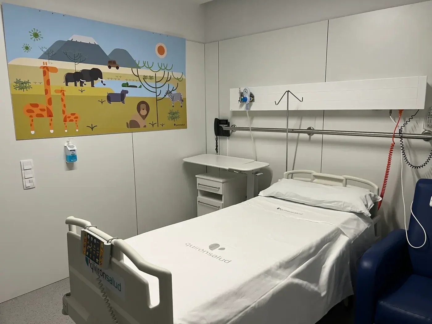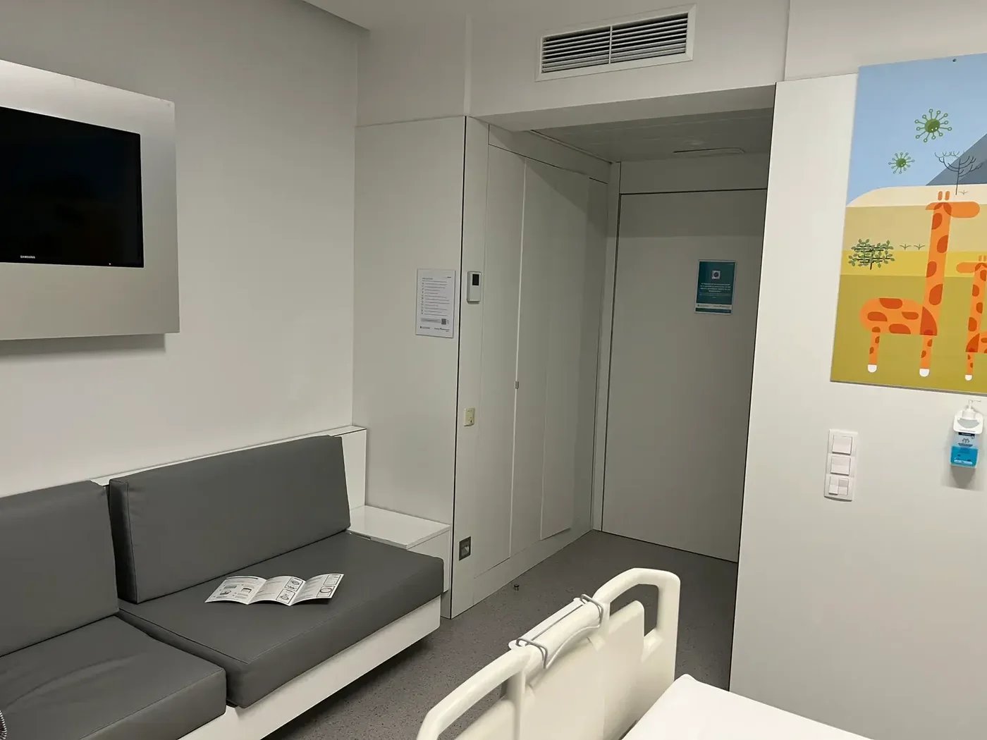 Палата напоминала гостиничный номер: медицинская кровать, отдельная ванная, шкаф с сейфом, диван (не разбирается), стул, столы, телевизор, раскладывающееся кресло, кроватка для ребёнка. Муж оставался со мной все ночи. А кормили только меня. Кормили хорошо, кроме завтраков: завтраки были типично испанские — tostada con tomate и кофе. Муж приносил мне омлет из дома.