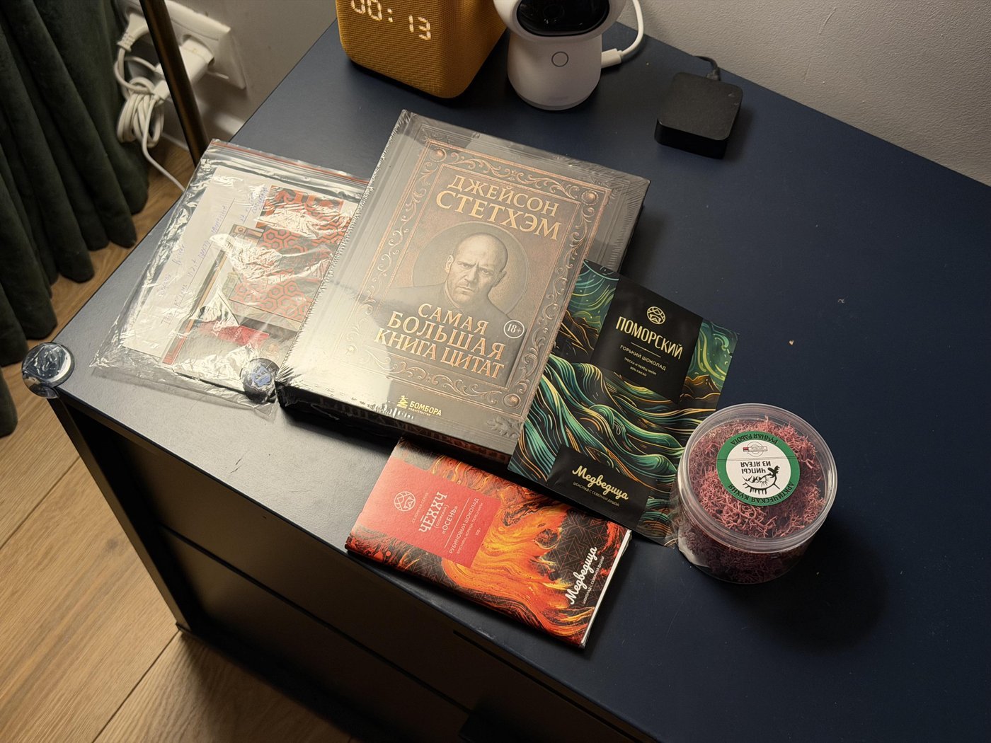 Свитшот с надписью просто невероятный, я точно его заношу. Чаями буду сейчас лечиться. Кулон прекрасен! Сванская соль уже ждет не дождется картошечки. А от котика мандаринки я даже прослезилась 😁 а чечил!! Ну вы поняли 😂 спасибо Санта. Мне кажется я даже почти выздоровела от радости)))