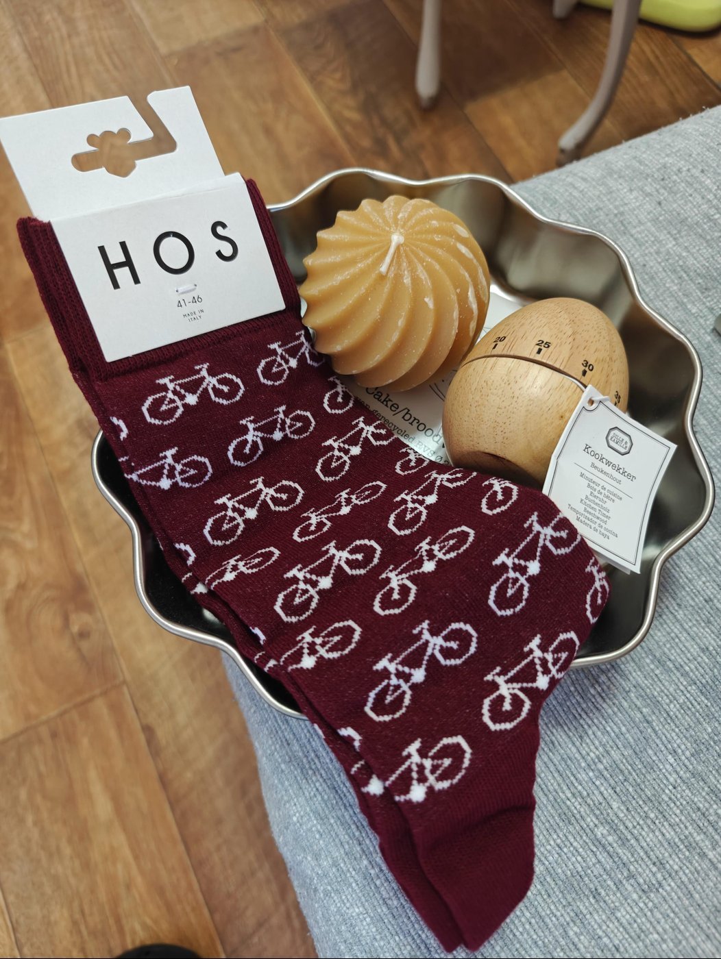 Зато какой шикардос, знаковые велосипедные носки, свечка для новогоднего стола, таймер-яйцо и форма для выпекания из экологичного переработанного металла - то, что нужно любителю иногда выпечь что-нибудь этакое на кухне!