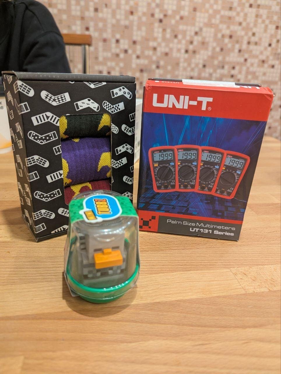 Во-вторых, носочки с уточками и уточка из Майнкрафта, в целом на этом можно было бы и остановиться, но нет! Мне достался ещё и офигенный карманный мультиметр от моей любимой фирмы UNI-T.