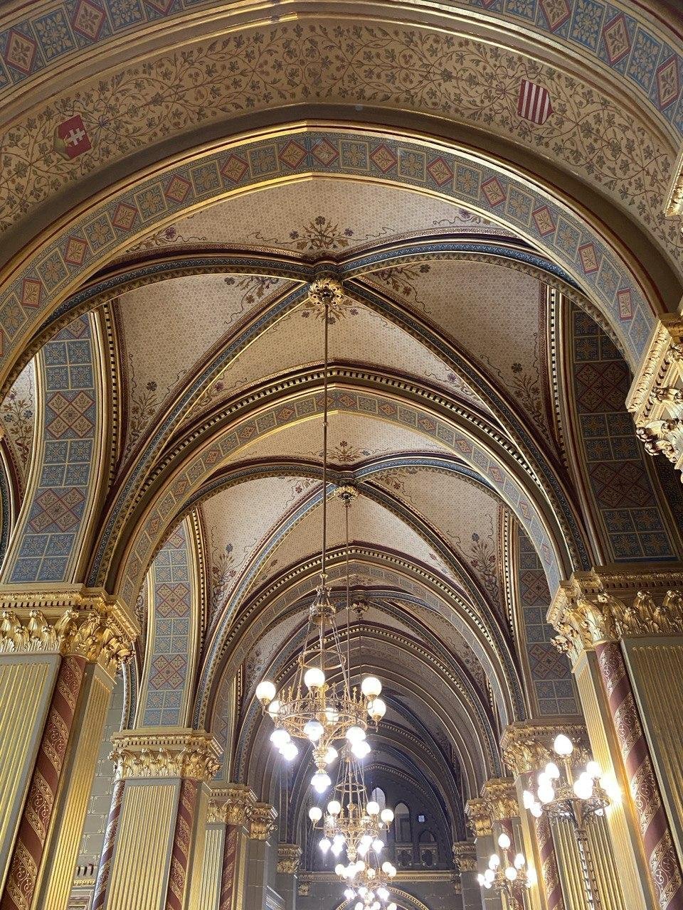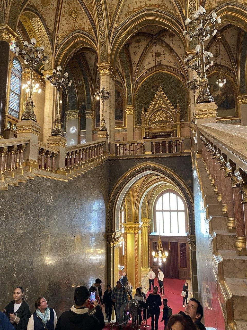 Я, конечно же, первым делом пошла в огромную очередь желающих посетить Парламент 📆🏫. Тайминг был такой: встала в очередь в 9:40, вышла из здания в 11:20, в самом Парламенте я пробыла 10–15 минут. Подойти и посмотреть Святую Корону близко возможности не было — ограничили зону для экскурсий. Не знаю, во все бесплатные посещения эта область ограничена или мне так повезло.