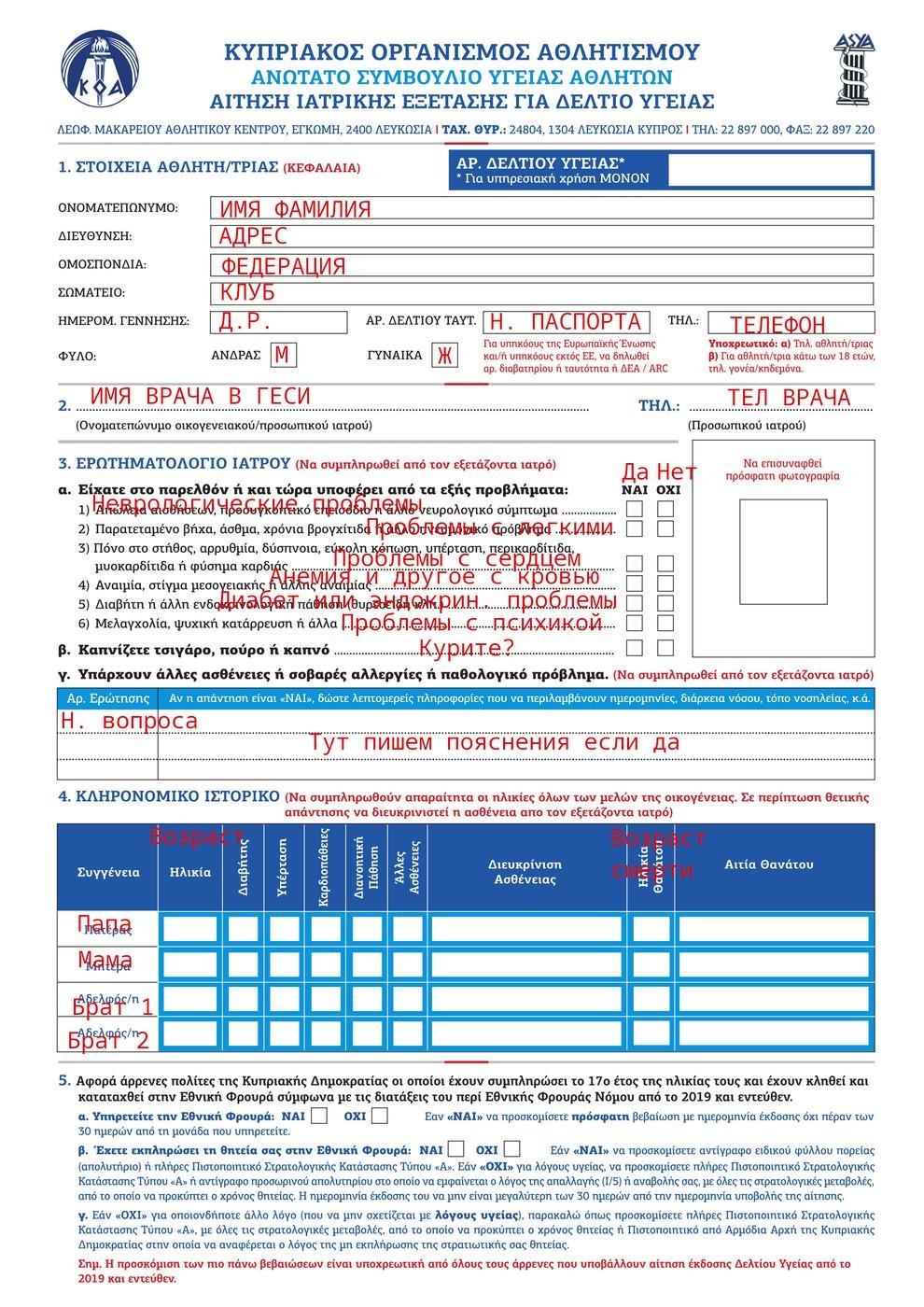 ΚΟΑ (Κυπριακός Οργανισμός Αθλητισμού) - верховный орган, который регулирует всю официальную спортивную деятельность на острове. Для нас тут важно, что именно они дают допуск атлетов по здоровью.