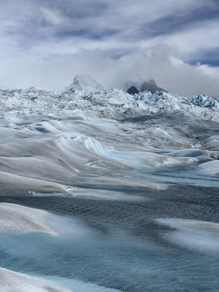 Наконец мы дошли до льда. Сначала он был грязным — почти как московский снег в конце зимы. Но чем дальше уходишь вглубь ледника, тем чище и прозрачнее становится поверхность. Оказалось, что сверху по льду текут целые реки, время от времени открываются огромные расщелины, а на горизонте вырастают зубцы ледяных гор. Картина абсолютно инопланетная.