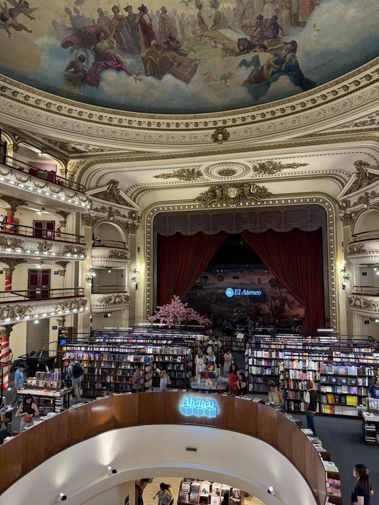 Дело было вечером, делать было нечего: так мы и оказались в том самом книжном магазине, который гордо считается самым красивым в Аргентине. Догадаться, почему он им считается, несложно: театр, сцена, балконы, эффектное пространство. Но у меня он почему-то вызвал ощущение лёгкого визуального перегруза. Слишком много всего сразу: неон, искусственное дерево, какие-то декоративные элементы, которые спорят друг с другом за внимание. В итоге вместо «вау» получилось скорее «ну… окей». Книжный, Буэнос-Айрес