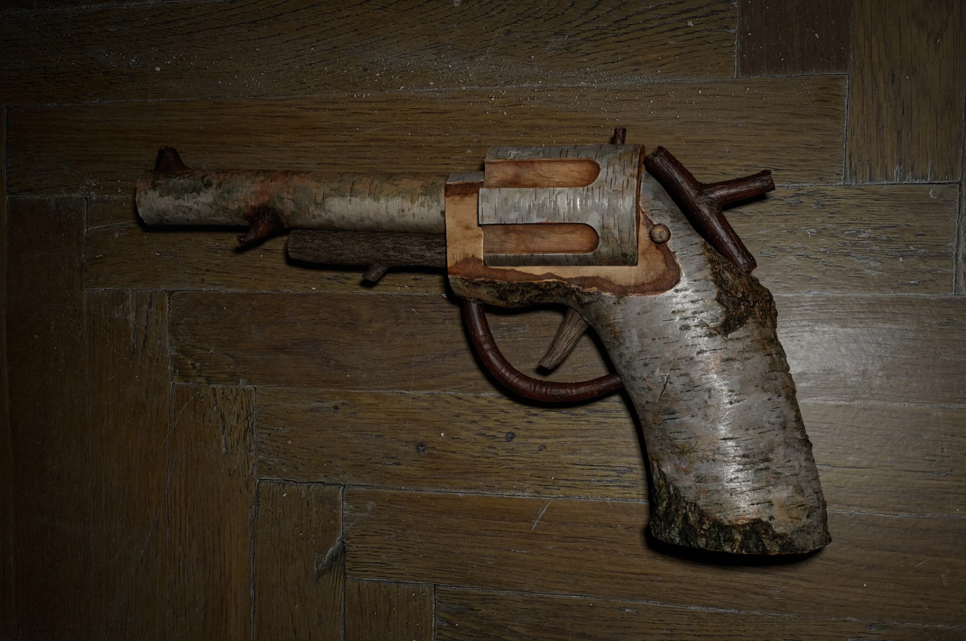 Анастасия Прокопович объяснила, как создала револьвер, подробно рассказав, как были вылеплены все детали и основная форма, и как ей удалось добиться древовидного вида материала.
