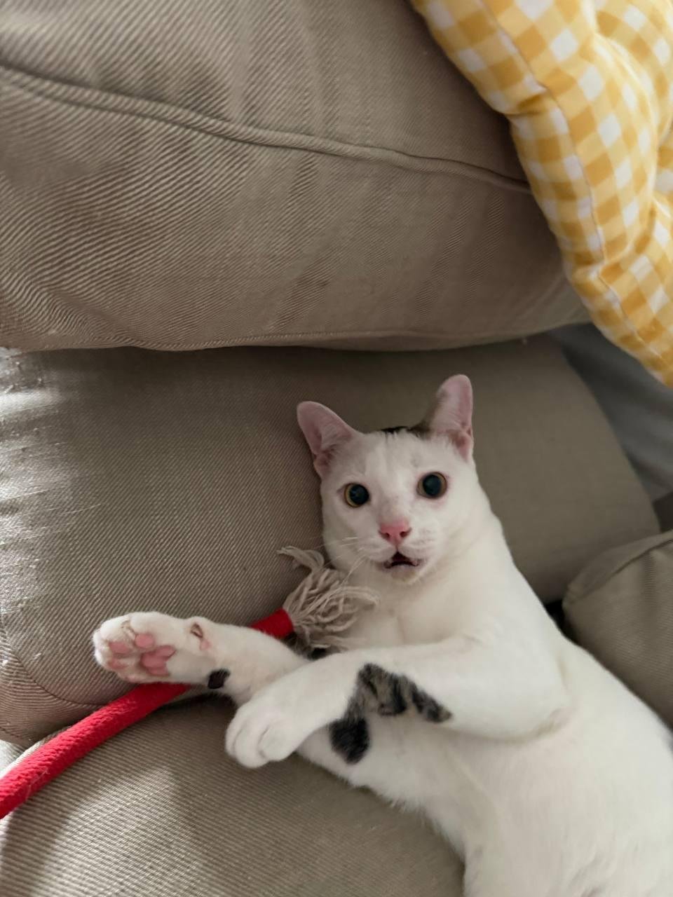 Спустя три дня она поселилась под моей кроватью (где, кстати, любит зависать до сих пор), через еще пару дней она стала играть с удочкой. Еще через пару запрыгнула на кровать и начала меня обнюхивать. В общем понятно было, что никакой передержки не будет, поэтому почти как два года у меня живет белая бестия с черным хвостом, которая очень не любит обнимашки, но обожает креветки (да, она слегка аристократка 👑).