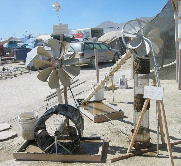 Этот тип не зависит от ветра - работает на насосе и солнечной панели. Уилбур молодец и реально её измерил: зело неточный датчик потока на входе, весовой датчик на резервуаре, логбук. За 8,5 дней один агрегат обработал ~488 литров (среднее 57 л/день, диапазон 45–68 л). Второй параллельный — ещё ~266 литров. Итого два устройства убрали три четверти тонны серой воды за один бёрн — фотоотчёт обоих в действии.