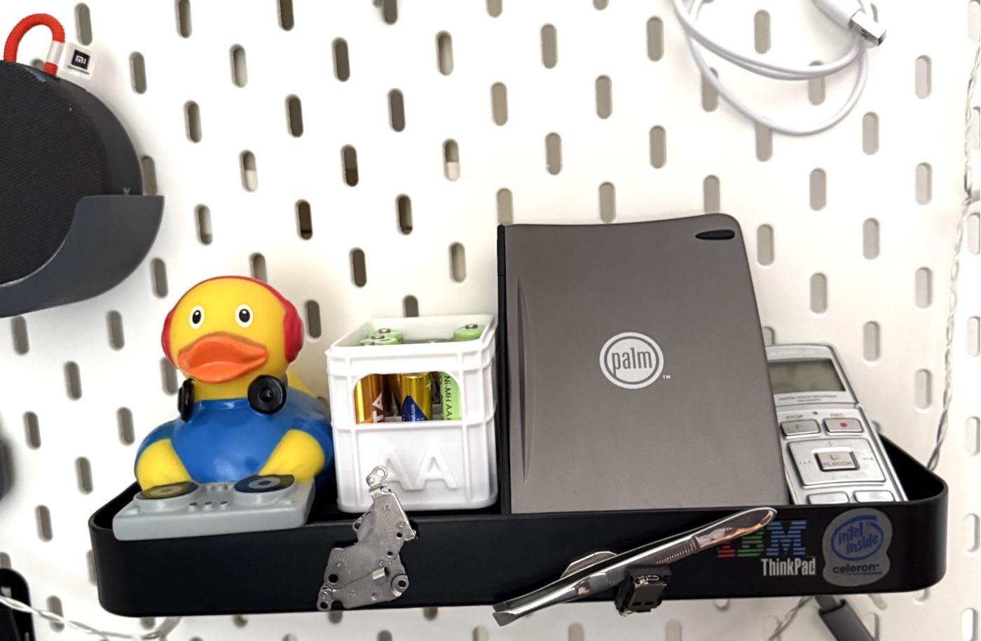 A wall-mounted cradle for the IKEA SKADIS pegboard that holds a cylindrical