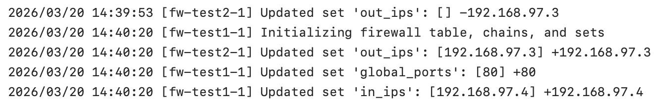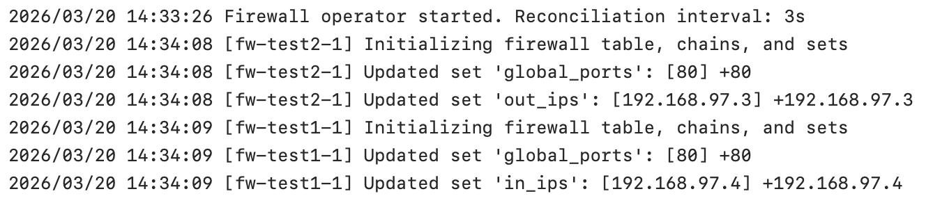 Как мы видим, Firewall operator нашел два контейнера, срезолвил ip из лейблов и применил конфигурацию.