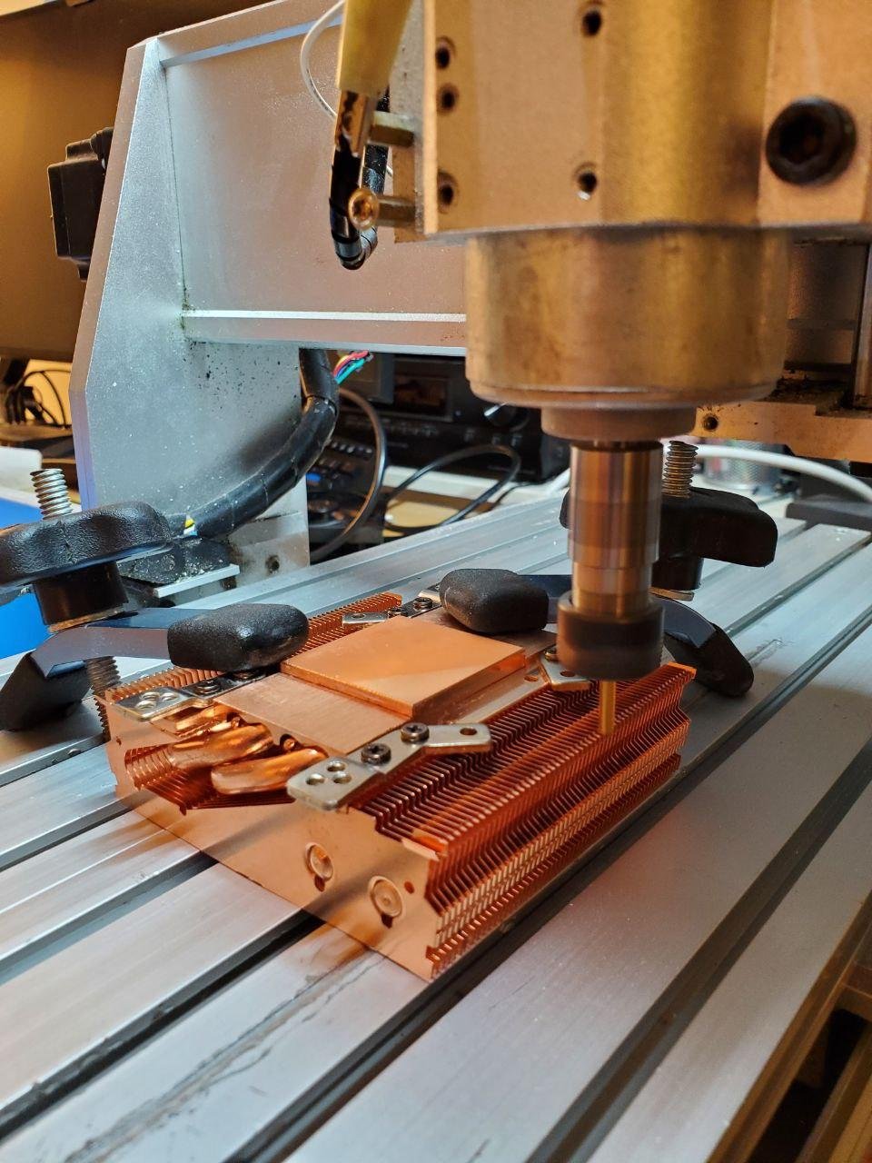 Решение — берём медную пластину (заказанную на том же самом амазоне), и выфрезеровываем в ней решётку радиатора (на него потом присобачим кулер), карман для катушки, карман для платы зарядки и дырки под магниты, и упаковываем всё в пластмассовый корпус (я его тоже выфрезеровывал, но сейчас бы тупо напечатал).