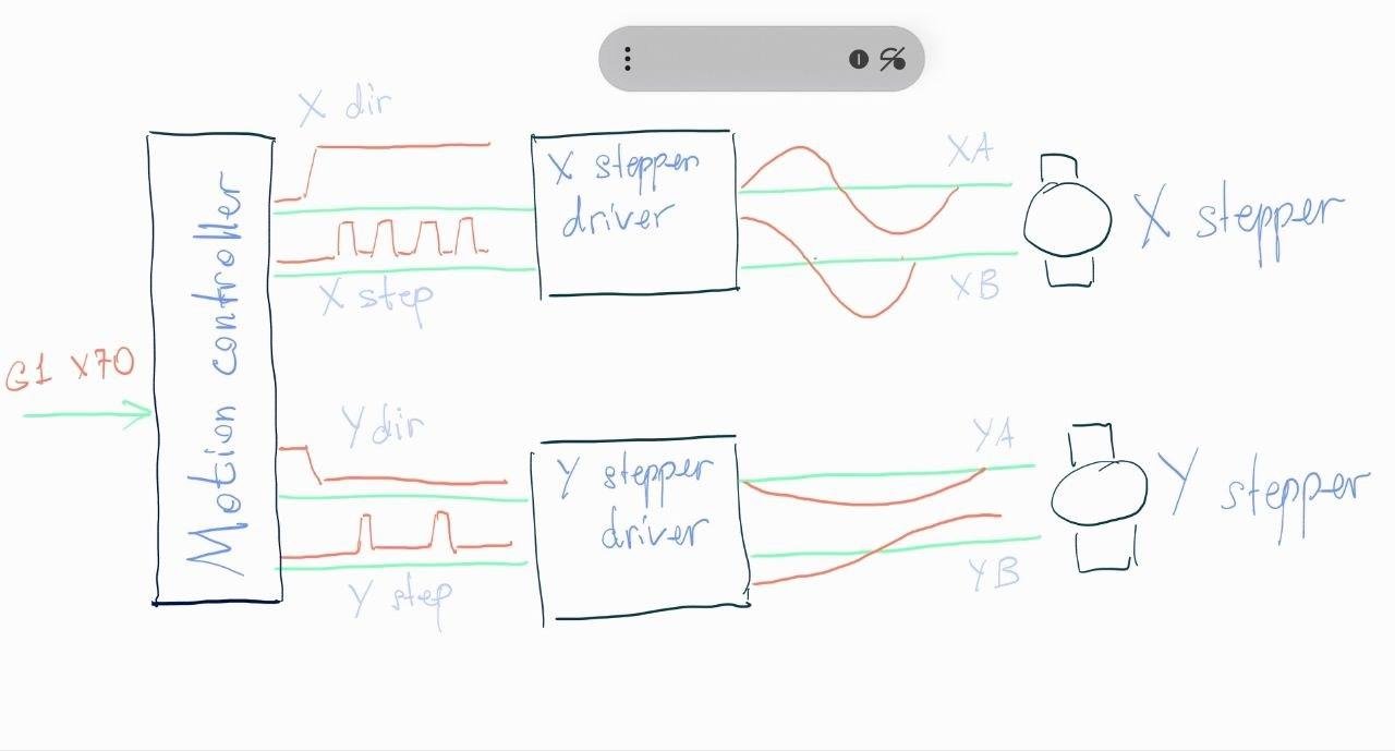 Дальше в цепочке у нас motion controller, который читает и интерпретирует G-Code и переводит его в команды вида «а теперь поворачиваем шаговик оси X ещё на один шаг по часовой стрелке» — в том числе с соблюдением требуемой скорости перемещения и ограничений по ускорению (нет, нельзя просто так одномоментно остановить довольно тяжёлую каретку, второй закон Ньютона никто не отменял).