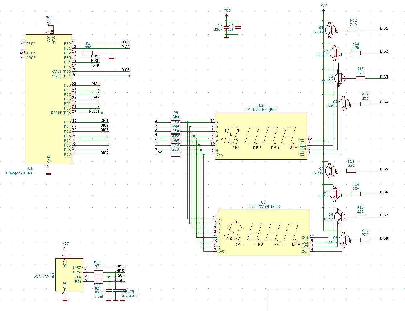 У меня в шкафу нашлась пара четырёхразрядных семисегментных индикатора. А почему бы мне не применить их так, чтобы плата рассказывала про обороты движка и момент, раз она всё равно их меряет?