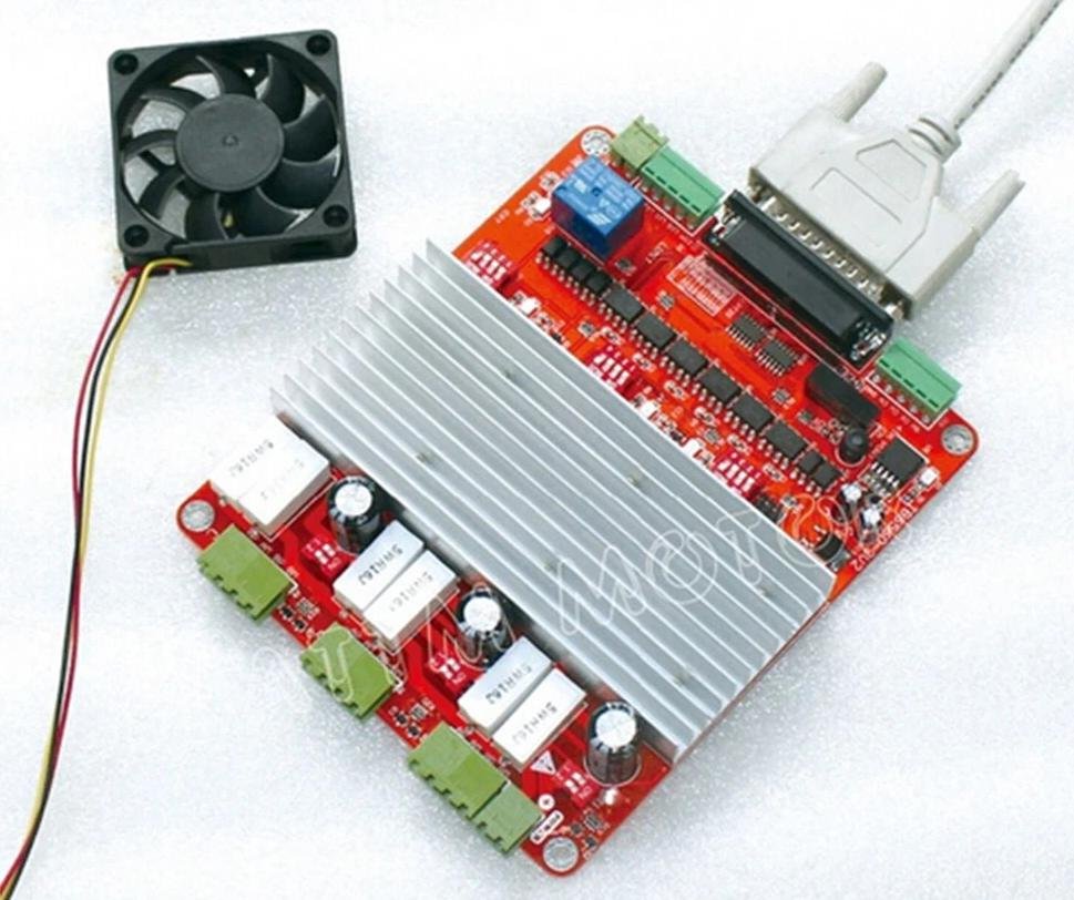 Под радиатором там почти наверняка будет три штуки TB6560AHQ (в целом довольно неплохих драйверов, которые умеют в дробные шаги, ограничение тока, защиту от перегрева, и могут стабильно выдавать 2 ампера на шаговики, чего для этого станка более чем достаточно), рядом батарея оптронов для гальванической развязки входа, ну и какой-нибудь блок питания на +24 / +48 V. Если повезёт, то импульсный.