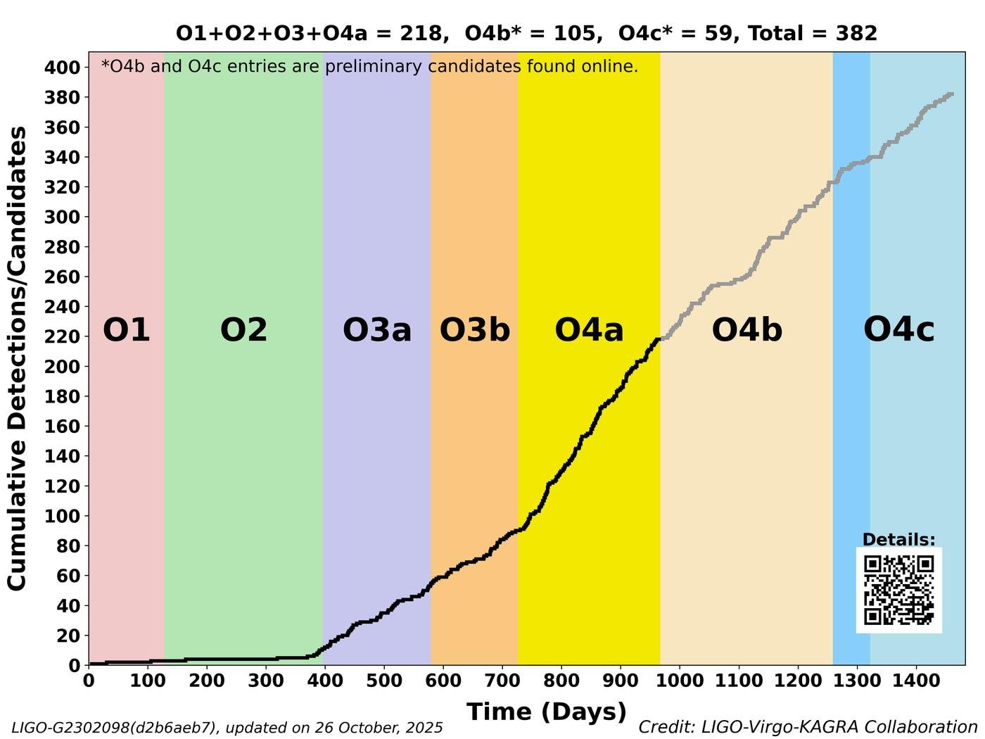 Мне очень нравится эта графика: она показывает все слияния, что мы видели до сих пор. По оси у тут масса черных дыр или нейтронных звезд. По оси х — ничего, просто для красоты так сделано. Очень наглядно показывает, сколько мы всего уже увидели. Большая часть всех этих наблюдений стала возможна благодаря сжатому свету. Всего мы видели 382 события (включая кандидатов, для которых обработка данных еще не завершена). ~360 из них зарегистировали при включенном сжатом свете.