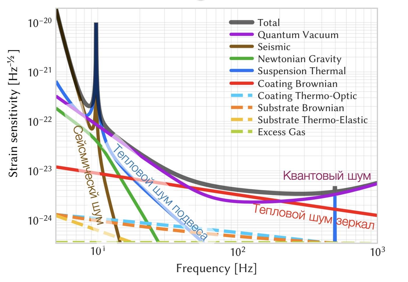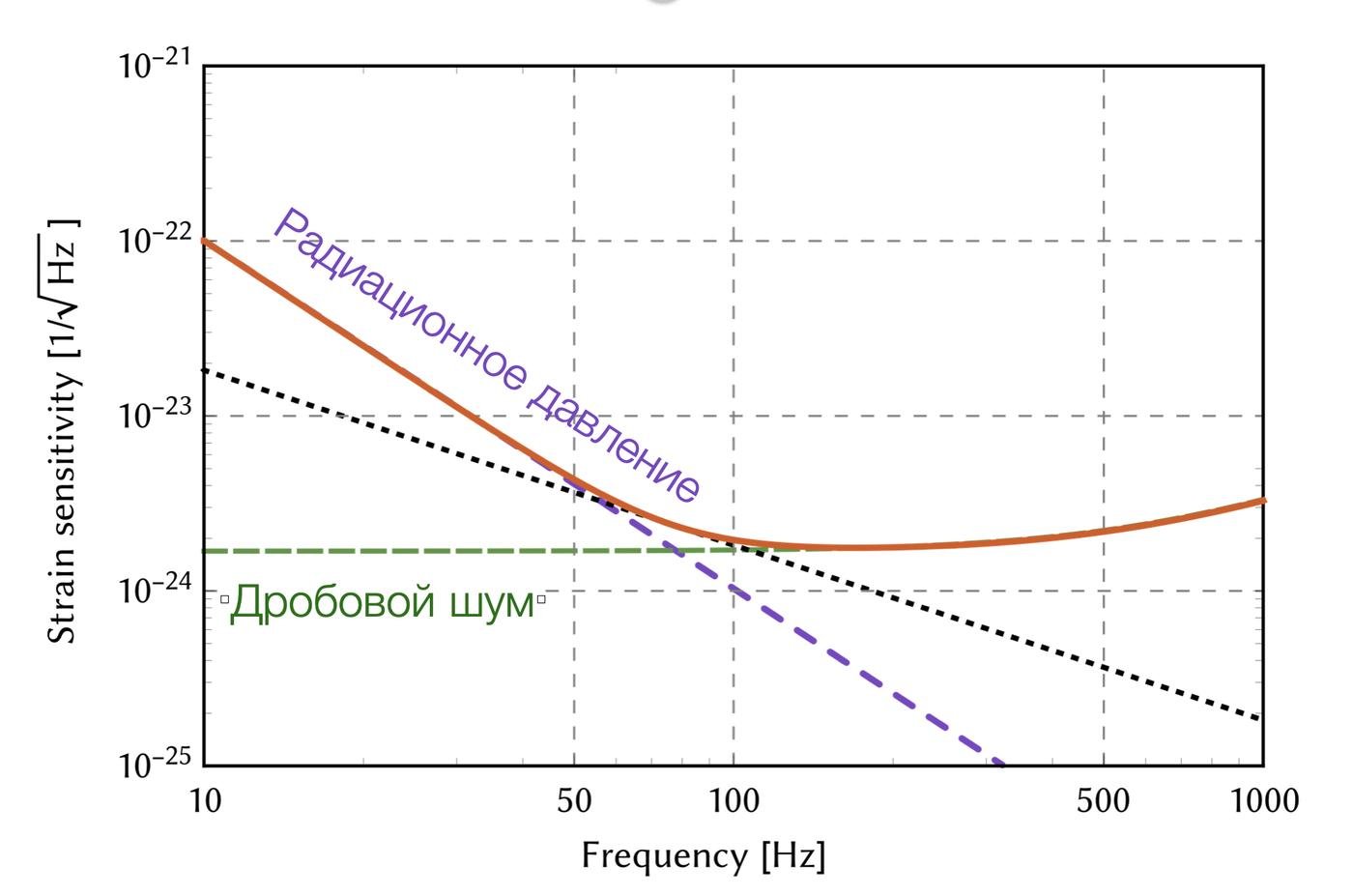 Обычно разрешающую способность детектора представляют как график зависимости наименьшего различимого сигнала от частоты. На разных частотах нам мешают детектировать разные шумы: скажем, на очень низких частотах влияет сейсмическая активность земли, на средних — тепловые колебания зеркал и подвесов, а на высоких — в первую очередь квантовый дробовой шум (про который мы уже говорили раньше).