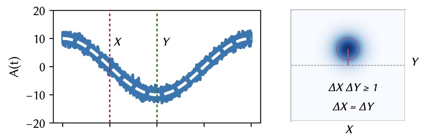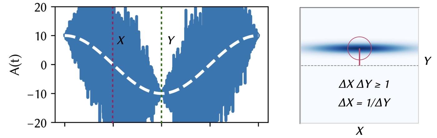 Ровно то же выполняется и для света — электромагнитной волны. Амплитуда и фаза электромагнитной волны тоже не могут быть измерены точно. То есть, если вы будете измерять лазерный луч с помощью фотодиода, вы будете наблюдать случайное распределение амплитуды. Ровно то же справедливо и для фазы. Обычно мы определяем это так: электромагнитная волна — периодические колебания. Мы представляем ее как сумму фазовых и амплитудных колебаний (мы говорим про “квадратуры” X и Y). Если вам нравятся уравнения, вот вам уравнение, наслаждайтесь!