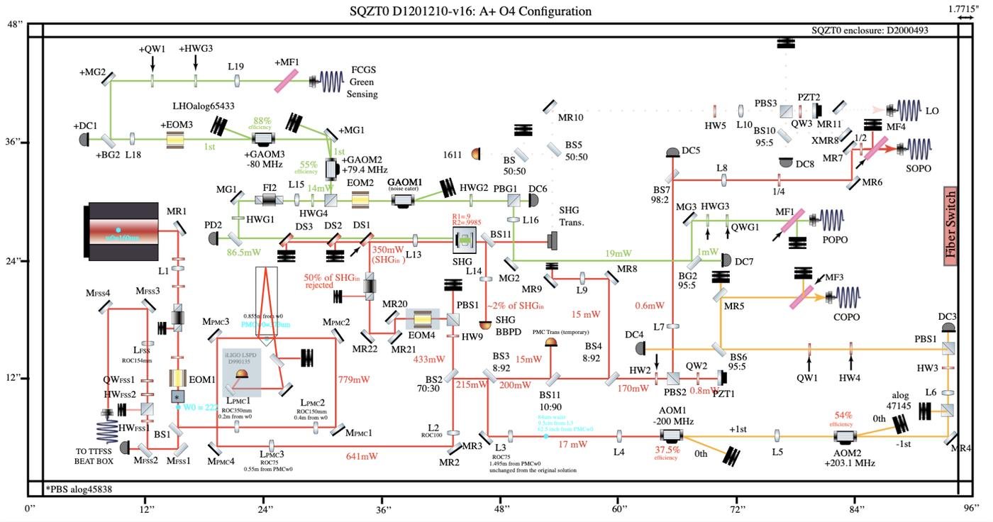 Увы, все не так просто. Во-первых, нужно создать свет накачки. Это мы обычно делаем в обратном нелинейном процессе (два фотона основного лазера создают один фотон накачки). Во-вторых, нужно очень аккуратно подготовить форму лазерного луча, чтобы он был сфокусирован именно на кристалле. В-третьи, нелинейный процесс сам по себе идти не хочет, кристалл надо как следует нагреть. А резонатор — поддерживать в состоянии резонанса (для чего нам понадобится сразу несколько дополнительных лазерных лучей). Короче говоря, все сложно. Вот так выглядит неполная схема сжимателя в LIGO: