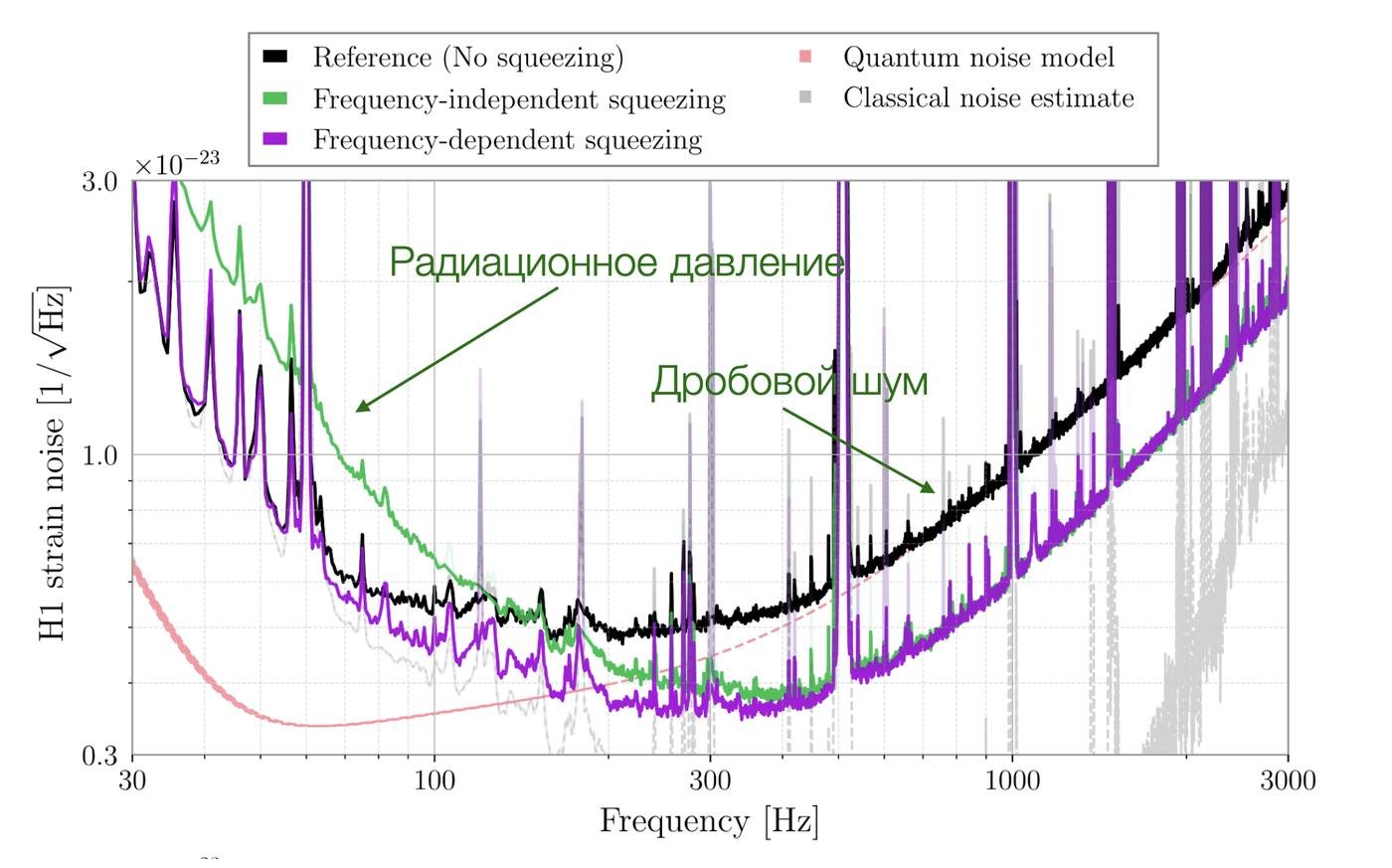 Тут на картинке видно: черным — без сжатия вовсе. Зеленым — сжатие без частотной зависимости: мы видим, что дробовой шум на высоких частотах снижается, а радиационное давление — растет. Потом они включили частотную зависимость (фиолетовая кривая): шум радиационного давления снизился, а дробовой шум так и остался сжатым. Правда, на низких частотах нам мешали технические шумы, поэтому фиолетовая кривая не снижается ниже черной. Но их можно вычесть и увидеть настоящее подавление шума радиационного давления.