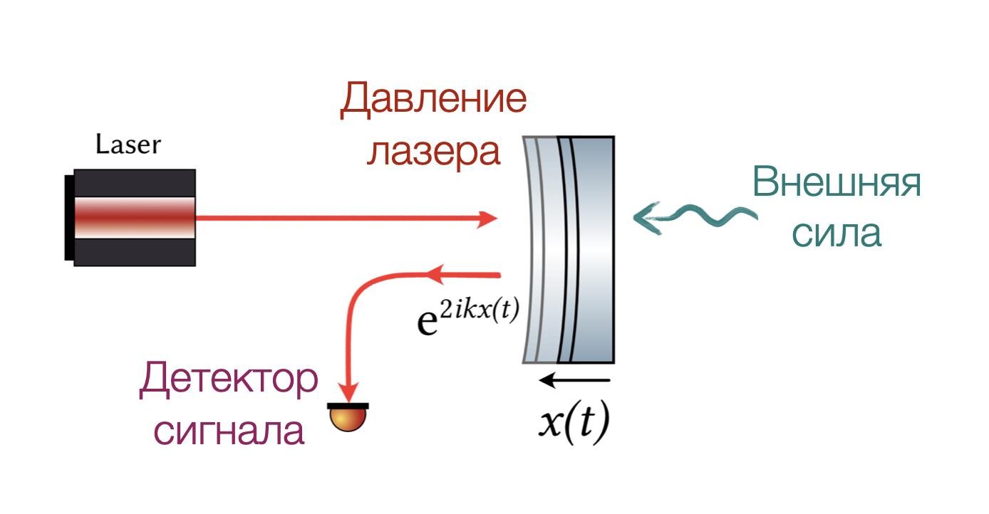 Давайте посмотрим на простую картинку: есть подвижное зеркальце, на которое влияет какая-то внешняя сила. Под действием силы зеркальце смещается. Мы светим на нее светом и фаза отраженного света изменяется в зависимости от положения зеркальца. Регистрируя фазу света, мы можем узнать, на сколько сместилось зеркальце и вычислить внешнюю силу. Так как фаза света меняется из-за квантовой природы света, мы видим шум на детекторе, который мешает нам регистрировать сигнал — это дробовой шум. Концептуально, именно так и работает детектор грав волн: