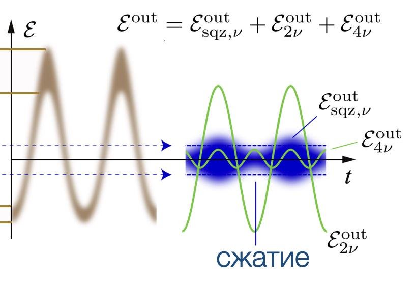 А что случилось с вакуумом? Давайте разложим поле обрано на сумму компонент. Смотрите, как хитро: накачка осталась синусоидой, а вот квантовый вакуум получил модуляцию! Там, где он был в “положительной” части входящего поля, он оказался усилен, а там, где в “отрицательно” — сжат. Никакой магии!